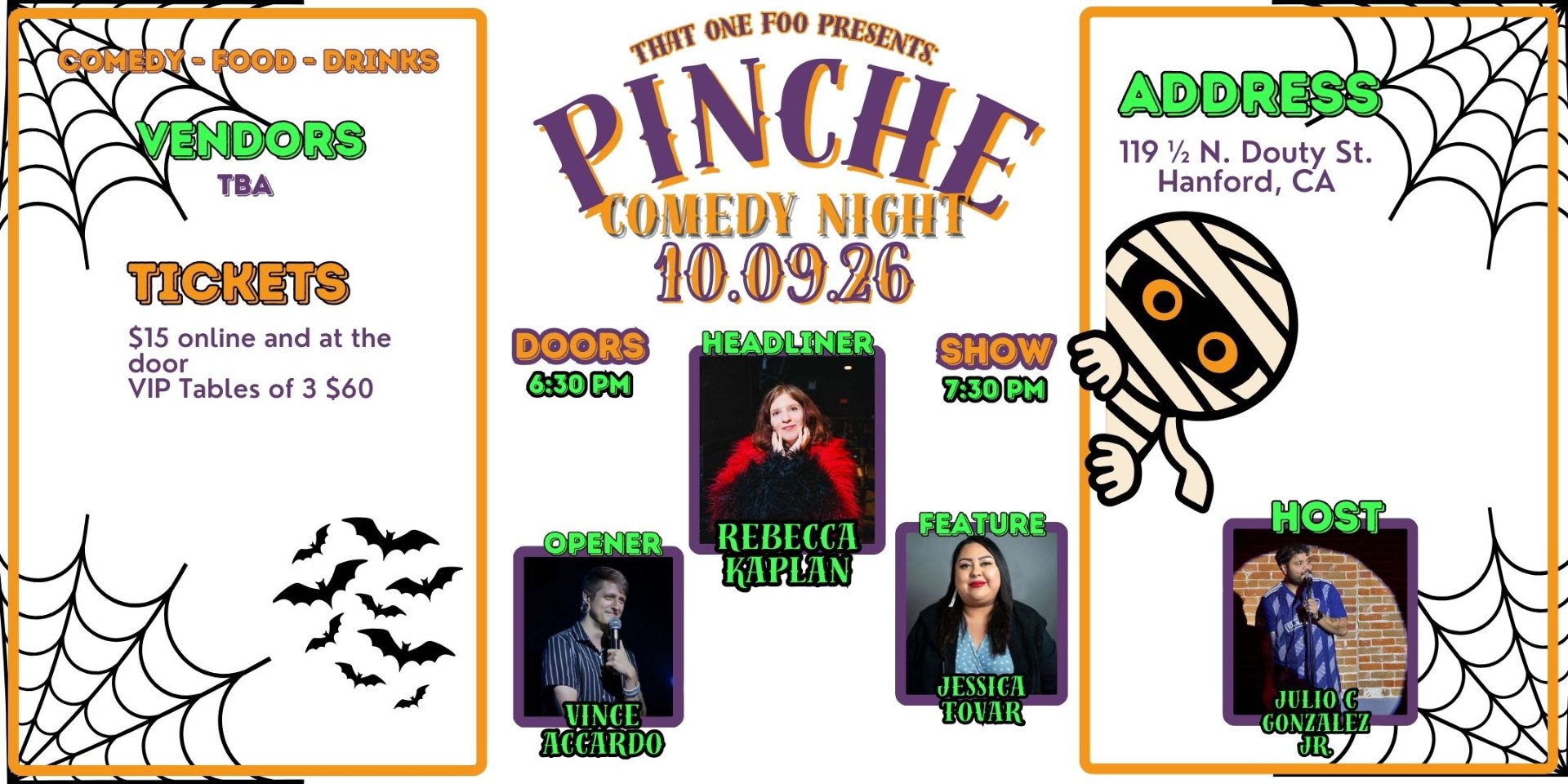 Pinche Comedy Night is back on October 9th, 2026, our bi-monthly show! We have an absolute killer lineup for you. Starting the night is none other than one of Fresno's funniest comedians, Vince Accardo from the Nothing's Wrong Podcast! Our feature comic is making her way from the Central Coast; she's the very funny Jessica Tovar. Our headliner is Rebecca Kaplan, who is an adorably awkward stand-up comedian. Her acerbic wit and relatable insights have entertained crowds all over the world. She's been featured on SiriusXM, NPR, and the front page of WorldStarHipHop. She lives in NYC, where she co-hosts the Bad Fan Fic podcast. She's touring California before she films her special later this year! So make sure you join us for this absolutely KILLER lineup.